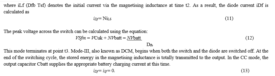 Mode II begins when switch Sf is turned off at instant t2. As the polarity of the HFT is reversed during the switch OFF moment and the output diode Df becomes forward biased, the output power is provided to the battery. The switch current is f and diode voltage VDf are both zero. The current flowing through the magnetising inductance at this time is denoted by