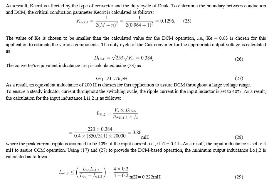 When n is the converter's isolation transformation ratio, Ts is the switching time, and Ton and Toff are the switch-ON and switch-OFF phases. n = 1 in the proposed non-isolated Cuk converter. Now, replace Vs = Vspk Sinωt and dc gain of the converter with M = VCuk/Vspk.