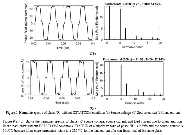 The performance of the distribution system with the DSTATCOM is examined; the output results are shown below. Figure.17. depicts the CPI voltages when the system is linked to the DSTATCOM under unbalanced conditions. Figure.18. shows the source current under unbalanced with DSTATCOM condition. Figure.19. and figure.20 are examples of formal represents the load currents due to non-linear and linear load-balanced conditions. The source currents and load currents are sinusoidal in the system up to t = 0.04s. Following, an unbalance is introduced into the system by removing the load of the ‘b’ phase at t = 0.04s. The VSC has begun to generate reactive compensating currents in order to balance and sinusoidalize the supply currents uniformly under unbalanced load conditions. The unbalance in load is controlled at t = 0.06s, the system resumes its previous performance. The three-phase diode bridge rectifier is linked across CPI to provide the nonlinear load. Figure.21. Represents the compensating currents with unbalanced nonlinear load, the compensating currents generated by VSC are added with harmonics polluted load currents to make supply currents balanced on the grid side. Figure.22. shows the DC link voltage of the system with DSTATCOM under unbalanced linear and nonlinear load conditions. It is maintained throughout the constant voltage.