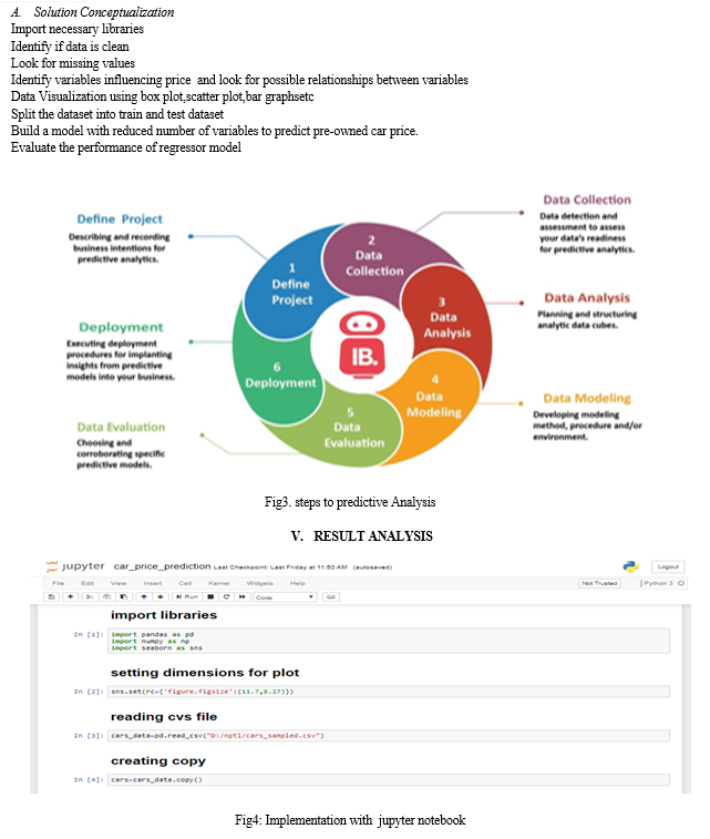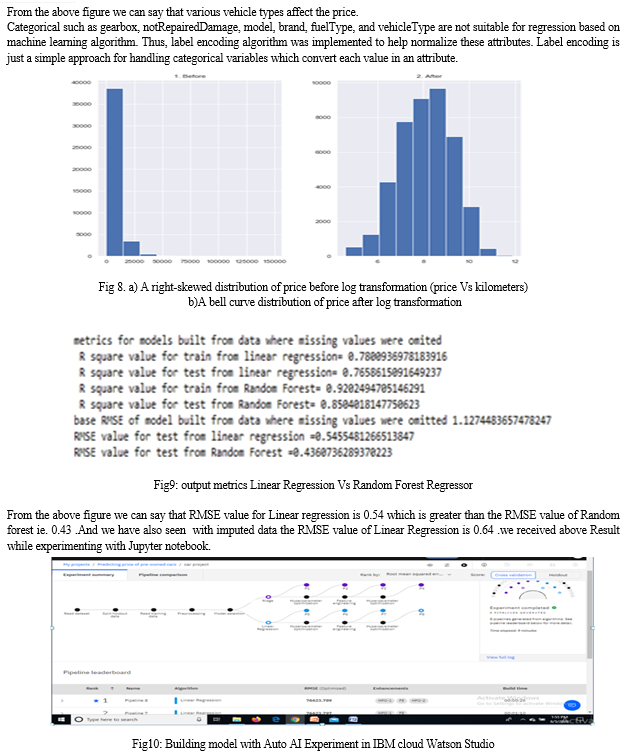 To give the solution for the above problem statement here we have used Machine Learning Algorithms like Linear Regression and Random Forest. Here we have used python language to develop source code. we have csv dataset in to the jupyter IDE. This data set contains 50000 rows and 19 columns(variables). As part of preprocessing we removed unwanted columns, duplicate records ,missing values and we have done data cleaning. The variables can be grouped into different buckets based on the imported pandas, numpy, seaborn libraries and we read cars_sample. information. We identified variables influencing price and looked for relationship among variables for that here we have used correlation, boxplot, scatterplot. We also identified outliers for that we have used box plots, histograms etc. We filtered data based on logical checks for that we have used variables price, year of registration, power and then reduced number of data. Here we have imported Train_test_split, Linear Regression, Random Forest Regressor, mean_square_error libraries from sklearn. These libraries are used for visualizing ,building models and evaluating performance. With these models one can predict the selling price of various car models and compare the price of car based on various features of the car to satisfy the buyer. The output models, metrics we can see in the console of jupyter.