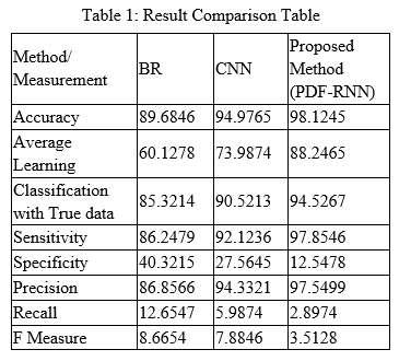 The following sections make up this paper: Section II lists significant publications in this field, and Section III details the proposed technique, which involves dataset selection, pre-processing, and classification using PDF-RNN. Section IV provides the findings and evaluations of the results, which are reinforced by Section V, which contains the research's general conclusion.