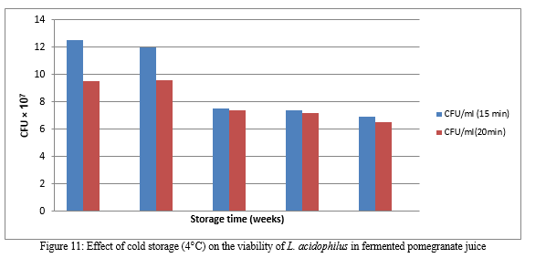 Fermentation of pomegranate juice using Lactic acid cultures at 30°C for 72 hours provided the products containing higher than106 cfu/ml after storage for 3 week at 4°C. Conversely, It was reported that the probiotication provided the high number of the cells above the benefit level in fruit juices, the sensory characteristics of the product were not accepted by the consumers. The above pic. illustrates the effect of cold storage on the viability of Lactobacillus acidophilus in fermented juices.