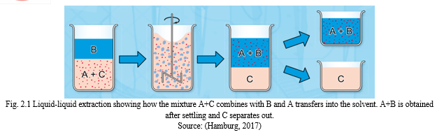 Solvent extraction involves the use of a liquid solvent to remove or separate a liquid component from a mixture of liquid. It is a selective removal of a solute using solvent from a liquid mixture. The component in transition is completely taken by the solvent and it is assumed that there is an absolute insolubility in the carrier liquid. Separation process occurs in two phases; the first is the extract phase where A and B mixes and C is the residue while at the Raffinate phase A and B becomes the residue and C is the main component of interest. To obtain a pure component of interest a process known as rectification is carried out. In this process, the component in transition is separated from the solvent. Fig 2.2 shows the principles of liquid – liquid extraction. The solvent can be recirculated for extraction again (Chizhkov et al., 2011; Yang et al, 2013; Mulle et al., 2015; Hamburg, 2017).