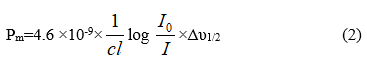 where c is the molar concentration of the absorbing ion per unit volume, I is the optical path length, logI0/I is absorbtivity or optical density and Δυ1/2 is half band width.