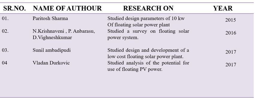 [1] DESIGN PARAMETERS OF 10KW FLOATING SOLAR POWER PLANT PARITOSH SHARMA1 , BHARAT MUNI2 , DEBOJYOTI [2] SEN3 4th Year Students, EN Dept, IMS Engineering College, Ghaziabad2 Assistant Professor, EN Dept, IMS Engineering College, Ghaziabad3Name of Publisher:-N. Krishnaveni , P. Anbarasu& D. Vigneshkumar [3] A SURVEY ON FLOATING SOLAR POWER SYSTEM N. Krishnaveni*, P. Anbarasu** & D. Vigneshkumar*** * Assistant Professor, Department of Electrical &Electronics Engineering, Dr. Mahalingam College of Engineering and Technology, Tamilnadu ** Assistant Professor, Department of Electrical & Electronics Engineering, Sri Eshwzar College of Engineering, Tamilnadu *** Deputy Manager (Projects), Global Wind Infrastructure Services Private Limited, Maharashtra [4] DESIGN AND DEVELOPMENT OF A LOW COST FLOATING SOLAR POWER PLANT SUNIL AMBADIPUDI#1, SRINIVASA RAO [5] GAMPALA#2, S.VENKATESWARLU#3 Assistant Professors, Dept of Mechanical Engg, SwarnaBharathiInstitue of Science and Technology, Khammam [6] Analysis of the Potential for Use of Floating PV Power Plant on the Skadar Lake for Electricity Supply of Aluminium Plant in Montenegro VladanDurkovi´c 1,2,* and Željko?uriši´c 2 ID [7] Armstrong, Robert (12 November 2014). \\\"The Case for Solar Energy Parking Lots\\\". Absolute Steel. Retrieved 15 November 2014. [8] \\\"Photovoltaic power generation in the buildings. Building integrated photovoltaic–BIPV\\\" (PDF). Bef-de.org. Retrieved 2011-06-20. [9] Elhodeiby, A.S.; Metwally, H.M.B; Farahat, M.A (March 2011). \\\"Performance Analysis of 3.6 kW Rooftop Grid Connected Photovoltaic System in Egyp\\\" (PDF). International Conference on Energy Systems and Technologies (IC- EST 2011): 151–157. Retrieved 2011-07-21. [10] \\\"Kyocera, partners announce construction of the world\\\'s largest floating solar PV Plant in Hyogo prefecture, Japan\\\". SolarServer.com. 4 September 2014. [11] \\\"Running Out of Precious Land? Floating Solar PV Systems May Be a Solution\\\". EnergyWorld.com. 7 November 2013.. [12] Sustainable Practices (Online) http://farniente.com/napa-wine-estate/sustainability/ [13] Sustainability for GundlachBundschu (Online) http://www.gunbun.com/solar [14] Strutture Per ImpiantiFotovoltaiciGalleggianti (Online) http://www.fotovoltaicogalleggiante.com/photovoltaic_floating_plants.html