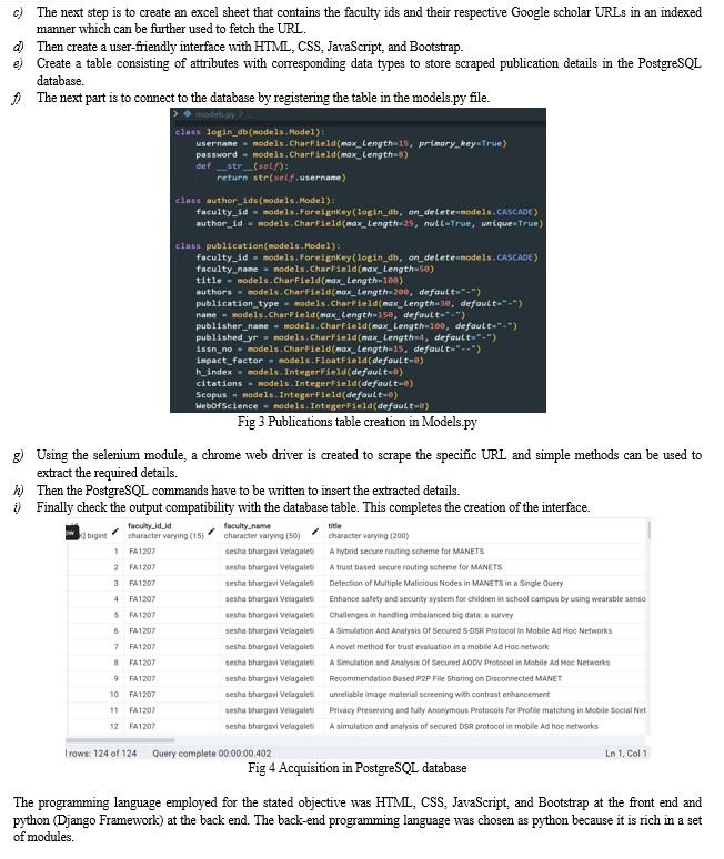 The interface is developed entirely in Python using Django Framework. The paper [5] UNO: A Web Application using Django helped in learning the process of creating the interface. It gave complete insight into creating a project using the Django framework. [6] Performance Analysis of PostgreSQL, MySQL, Microsoft SQL Server Systems Based on TPC-H Tests gave analysis on different types of databases that can be used and helped in choosing PostgreSQL which can store huge data and has many features like data integrity, fault-tolerant environment. [1] Web Scraping and Data Acquisition Using Google Scholar gave insights on scraping data from Google Scholar. This paper focused on publication data acquisition from Google Scholar to database and excel sheet using Web Scraping with Beautiful Soup. The details of journals and conferences like impact factor, h-index which are not available on Google Scholar website cannot be extracted. The above paper is not providing searching options for users to extract publications based on faculty name, ISBN number, Publication title etc. The proper scraping method should be needed which allows movement from one page to another page and scrape multiple pages at a time. Scraping using selenium is chosen after analyzing the paper [4] Web Scraping based Product Comparison Model for E-Commerce Websites.