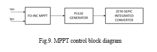 In this MPPT block diagram, the duty cycle is generated by first sensing the PV voltage and current using the fractional order Incremental algorithm (FO-INC). MPPT control is used to control the proposed converter. The incremental approach is commonly used to track the maximum power point. A fractional order incremental is introduced in this technique to cause the PV module’s power to vary. The PV output power is periodically measured and compared with the previous power.
