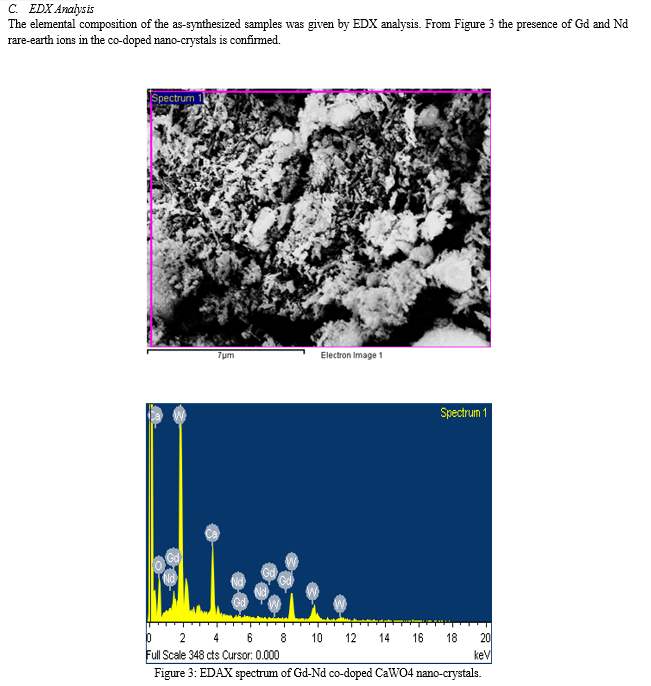 To estimate the size of the nano-crystals synthesized and to confirm the incorporation of rare-earth ions into the host lattice (CaWO4) of nano-crystals different techniques were used. The phase of the formed nano-crystals was identified by X-ray diffraction (XRD)analysis using an automated X-ray powder diffractometer at an operating voltage of 40kV and current of 30 mA with scanning rate of 4.0 deg min-1, within a range from 10° to 80°.The size of the nano-crystals formed was determined by using FESEM(Carl Zeiss Model no : Ultra 55).The EDAX (Energy dispersive X ray analysis )was carried out using Oxford: INCAX-act model, device and the incorporation of rare-earth ions was clearly identified. Further, the photoluminescent properties of the Gd-Nd co-doped CaWO4 nano-crystals were determined at different excitation wavelengths using HORIBA FL3-21 TCSPC model spectrofluorometer.