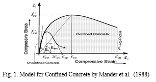 2) Stress-Strain Characteristics for Concrete - The stress-strain curve of concrete in compression forms the basis for analysis of any reinforced concrete section. The characteristic and design stress-strain curves specified in most of design codes (IS 456: 2000) do not truly reflect the actual stress-strain behavior in the post-peak region, as (for convenience in calculations) it assumes a constant stress in this region (strains between 0.002 and 0.0035). In reality, as evidenced by experimental testing, the post-peak behavior is characterized by a descending branch, which is attributed to ‘softening’ and micro-cracking in the concrete. Also, models as per these codes do not account for strength enhancement and ductility due to confinement. However, the stress-strain relation specified in ACI 318M-02 consider some of the important features from actual behavior. The model is a modified version of Mander’s model (Mander et al. 1988) where a single equation can generate the stress fc corresponding to any given strain Fig. 1 shows a typical plot of stress-strain characteristics for M-30 grade of concrete as per Mander’s model.