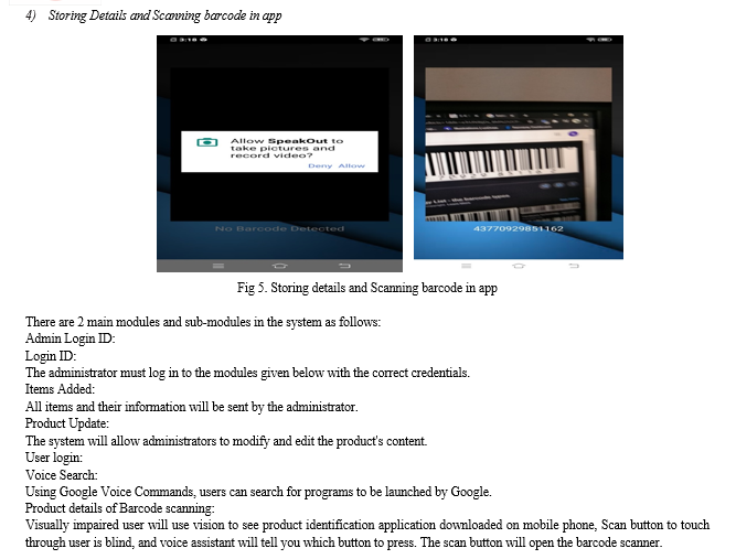 This research is designed to make life easier for visually impaired people. It is a camera-based system that scans the barcode on the back of the image and uses the ID stored in the barcode to display the model of the product. This will help visually impaired people see the contents of the market so they can buy packaged products. This is because blind people have a hard time distinguishing between grocery stores. To use this technology, users simply have to capture the image of the product on their phone and then identify the barcode; that means it scans the image to find the ID to hide. So this app is really helpful for blind and visually impaired people to do their job of identifying things easily It is very easy to use and inexpensive as it requires a scanner to scan the barcode and a phone camera to capture the image containing the image of the barcode. This is now very easy to do as most modern phones have a solution to scan the barcode to identify the ID stored inside and read the description of the goods. This program is usually available in all shops, department stores, bookstores, pharmacies, etc.