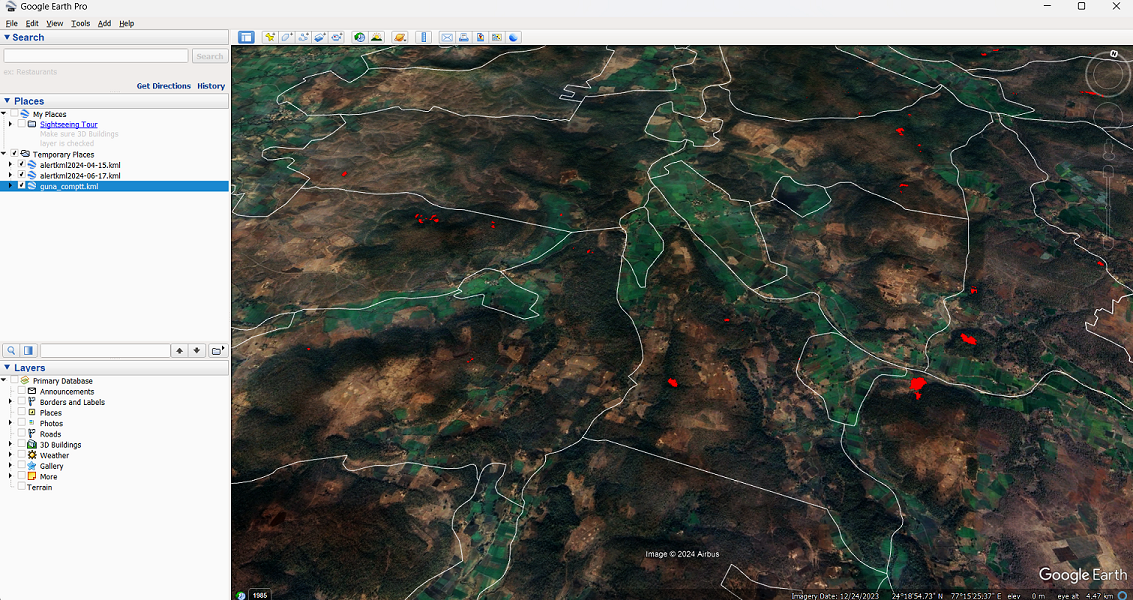 The alert system was tested on a specified forest area, demonstrating its ability to detect significant land use changes over short time intervals. The system successfully generated KML and CSV files that highlighted areas where forest cover had been reduced, either due to conversion to agricultural land or other disturbances.