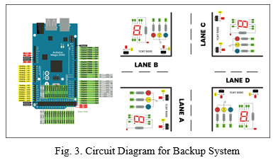 As the name suggests, the backup system comes into action in an emergency situation where the main system fails. The backup system makes use of eight TCRT5000 infrared sensor modules (two sensors on each lane) to monitor traffic. Just like the primary system, the backup system too uses three 5mm LEDs to demonstrate each traffic signal. Four 7-segment displays are used as timers to display the time for which the respective lanes will remain green. For the backup system, each hardware component is connected to the Arduino Mega 2560 board that is ultimately attached to the computer. Arduino IDE (Integrated Development Environment) makes up the complete software for this system. Fig. 3 reveals the circuit diagram for the backup system.