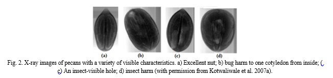 An encouraging method that makes use of a non-contact sensor to inspect large samples while significantly providing information is X-ray imaging (Yacob et al., 2005). Soft X-ray imaging is a quick, non-destructive, and direct method that is used to find invisible insects in stored food grains (Karunakaran, Jayas, & White, 2003), grade agricultural produce, and determine the internal quality of the produce (Kotwaliwale et al., 2014). The X-ray source that is included in the imaging system; X-beam converter; image capture system and isolated casing (Kotwaliwale, Kalne, & Singh, 2011). A casing separated the imaging medium from the radiation around it and captured the images (Kotwaliwale, Subbiah, Weckler, Brusewitz, & Kranzler, 2007). Electromagnetic rushes of 0.1-10 nm frequencies with 0.12-12 KeV energy are utilized as delicate X-beam for inner examination in exceptionally less time (3-5 s) to create a X-beam picture