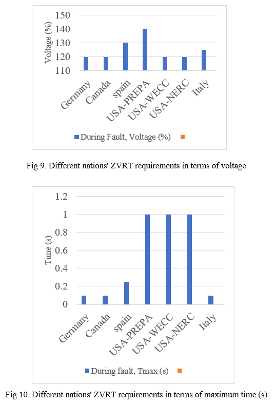 2. Zero-voltage Ride Through: Since Zero-voltage ride through depicts a zero-voltage situation, it can be considered a subset of LVRT. As a result, the RES can remain in integrated with grid and maintain frequency of grid at constant. In zero-voltage conditions, RESs, like LVRT, should help with grid stability and voltage recovery by reactive current injection. Fig.s 7 and 8 show the international use of ZVRT parameters in terms of percentage of voltage and maximum time (s). Disconnecting of macro grid when voltage sag occurs was illegal under every law examined, even if the voltage was zero. In contrast, the maximum recovery voltages (Vmax) and timeframes vary widely. There should be no exceptions to this rule at the PCC [43]-[47].
