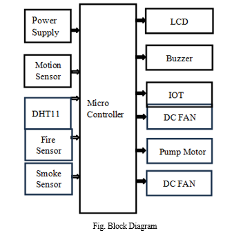 The hardware configuration is essential for the smooth integration of all components. The central processing unit, or CPU, is the ESP32 microcontroller, which handles control, processing, and data gathering. Numerous sensors are attached to it, such as the DHT11 sensor, which measures temperature and humidity, the motion sensor, which detects movement of objects, the fire sensor, which detects fires or unusual heat, and the gas sensor, which detects dangerous substances. A buzzer and DC fan provide audible and visible alerts in reaction to detected threats, and an LCD display additionally gives consumers real-time feedback.