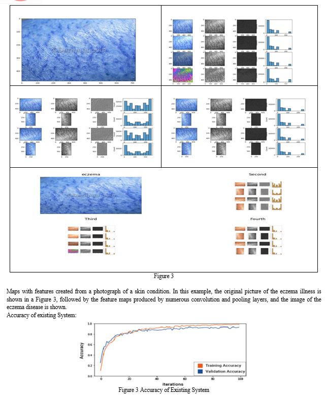 Data augmentation, which enables professionals to dramatically expand the diversity of data available for training models without gathering new data, is crucial in reducing the over-fitting issue. On our dataset, data augmentation methods like brightness augmentation by 20%, contrast augmentation by 10%, random rotation by 5 C, and horizontal flipping have been employed for improved interaction and taking into account all potential variations. We produced five distinct enhanced versions of each example image in this way. To split the training and validation data, we employed an 80-20 ratio. Consequently, there are 4800 training photos and 1200 validation images. To split the training and validation data, we employed an 80-20 ratio. Consequently, there are 4800 training photos and 1200 validation images. We used 400 pictures of skin conditions that we found online for testing purposes. The training pictures' traits are present in these testing photos as well. To minimize any predisposition, the testing photos were completely separated from the training and validation data.