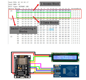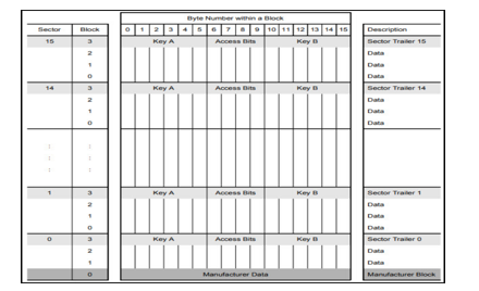 For example, Sector 0 has Blocks 0, 1, 2 and 3. Sector 1 has Blocks 4, 5, 6 and 7 and so on and finally Sector 15 has Blocks 60, 61, 62 and 63. Each Block can store 16 Bytes of data.[14]