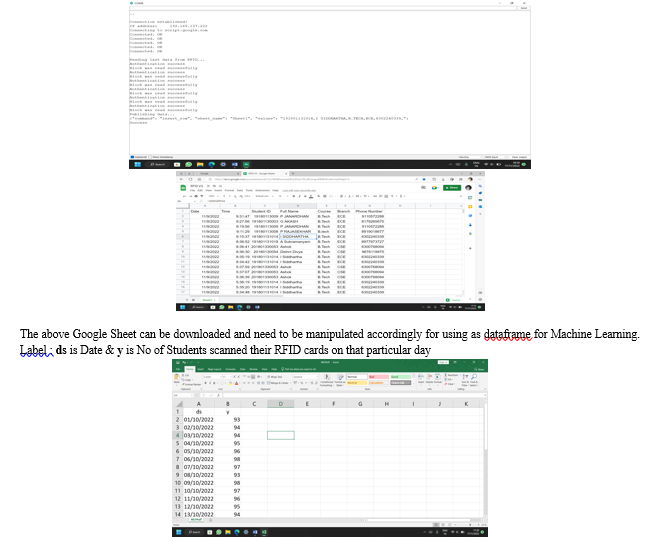 And that’s how developed an NodeMCU based Automated Attendance System using RFID [4]technology with the help of Arduino UNO microcontroller, Data Acqusition is done through IOT, So as soon as the student scans his ID card, Name & Number will be displayed on LCD for Attendee reference, Buzzer also make sounds on a RFID card detection[4]. And then the same student data will be sent to Google Sheets - Cloud. The data will be saved automatically Spreadsheets. After a thorough data collection i.e for about 1 month, the data has been used for Machine Learning, So based on Machine Learning generated Output.xlsx file data, Kitchen department can prepare food.