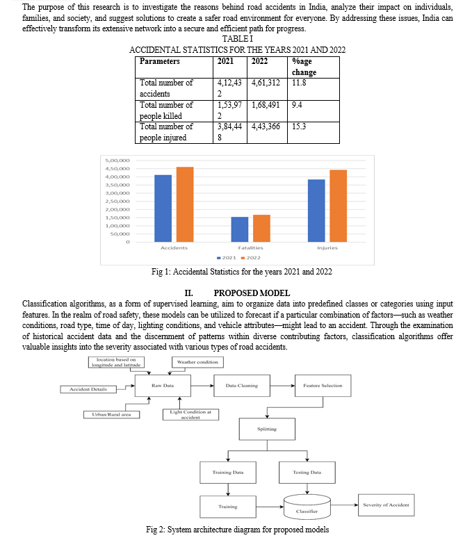 [1] Ministry of Road Transport and Highways, Government of India: https://morth.nic.in/road-accident-in-india [2] https://worldpopulationreview.com/country-rankings/road-quality-by-country [3] World Health Organization: https://www.who.int/publications-detail-redirect/9789240086517 [4] Ministry of Road Transport and Highways, Government of India: https://morth.nic.in/sites/default/files/RA_2022_30_Oct.pdf [5] Z. Zhang, “Introduction to machine learning: k-nearest neighbors,” Annals of Translational Medicine (2016), vol 4, issue no. 11, pp.218- 218. [6] H. ?. Bülbül, T. Kaya and Y. Tulgar, \"Analysis for Status of the Road Accident Occurrence and Determination of the Risk of Accident by Machine Learning in Istanbul,\" 2016 15th IEEE International Conference on Machine Learning and Applications (ICMLA), Anaheim, CA, 2016, pp. 426-430.