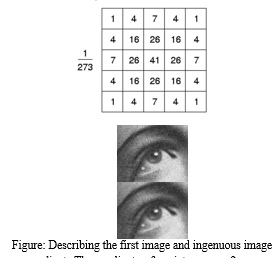 Filter uses a second distribution to perform convolution. The burden of the matrix is targeted at the middle, thus any noise showing within the outside columns and rows are eliminated, because the weight decreases outward from the middle value. The increasing of ordinary deviation reduces or blurs the intensity of noise.