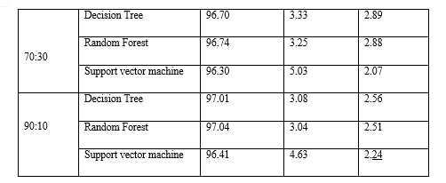 Mahajan et al. (2018) further supported these conclusions, demonstrating Random Forest's superior performance compared to Decision Trees and Support Vector Machines across various dataset splits, emphasizing the importance of ample training data for improved model accuracy [18].