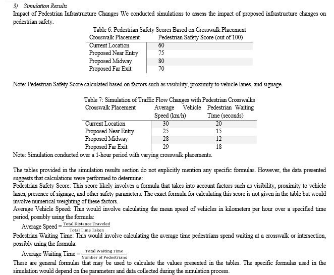 Limitations and Future Research: It's important to acknowledge the limitations of this simulation study, such as simplified traffic scenarios and idealized pedestrian behaviors. Future research could incorporate real-world data, dynamic traffic simulations, and pedestrian behavior modeling for more accurate assessments. Additionally, studying the long-term effects of these infrastructure changes and conducting field experiments can further validate the simulation results and guide evidence-based decision-making in urban planning.
