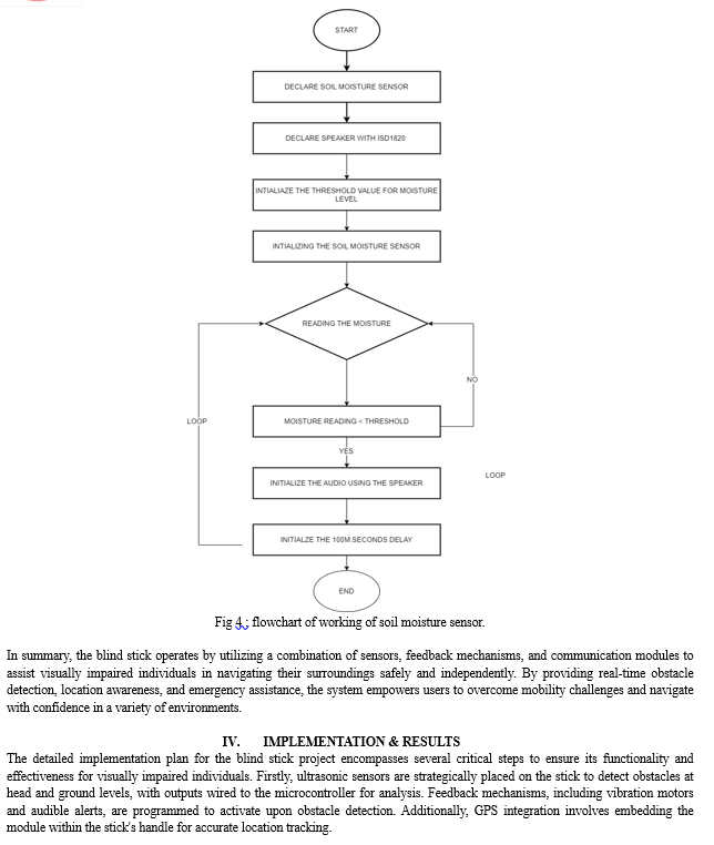 Key features of the Smart Blind Stick include two ultrasonic sensors strategically positioned along the length of the stick: one at the middle and another at the bottom. The middle ultrasonic sensor is tasked with detecting obstacles at head level, such as overhanging branches or signposts, while the bottom sensor identifies ground-level hazards like potholes and manholes. This dual-sensor approach ensures comprehensive coverage and provides users with timely alerts to navigate obstacles safely. In addition to the ultrasonic sensors, the Smart Blind Stick is equipped with a soil moisture sensor, a crucial component for detecting wet surfaces. This sensor plays a vital role in alerting users to potential slip hazards, such as wet pavements or puddles, thereby minimizing the risk of accidents or falls. The integration of a speaker featuring the IS 1820 IC further enhances the device's functionality by providing audible warnings of detected hazards, enhancing users' situational awareness and enabling them to make informed decisions about their path of travel. In summary, the Smart Blind Stick represents a significant step forward in assistive technology for visually impaired individuals, offering a compact yet comprehensive solution to the challenges of navigating urban and outdoor environments. By combining advanced sensors, intelligent data processing, and intuitive feedback mechanisms, this innovative device empowers users with improved situational awareness and confidence, ultimately enhancing their quality of life and independence.