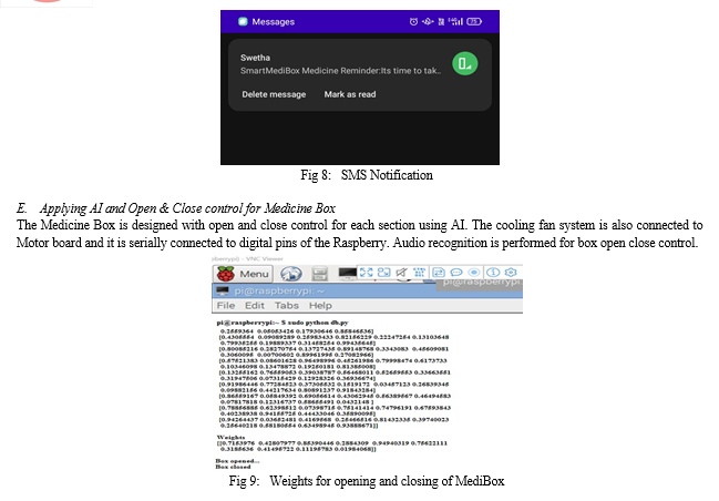 The suggested model includes an intelligent medicine box that notifies patients when it is time to take their medications. It is connected to the internet so that notifications via an Android application can provide timely updates about the medication to the patient's smartphone. If any vital signs are detected, SMS notifications are sent to the designated guardian. [3]