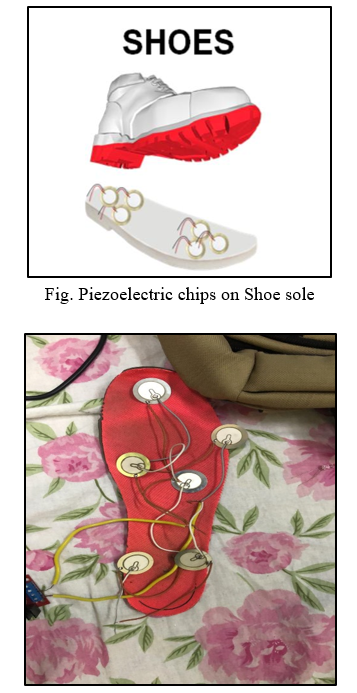 The piezoelectric chip is mounted on shoe soles to generate pressure force and it will convert into electrical energy by piezoelectric effect.