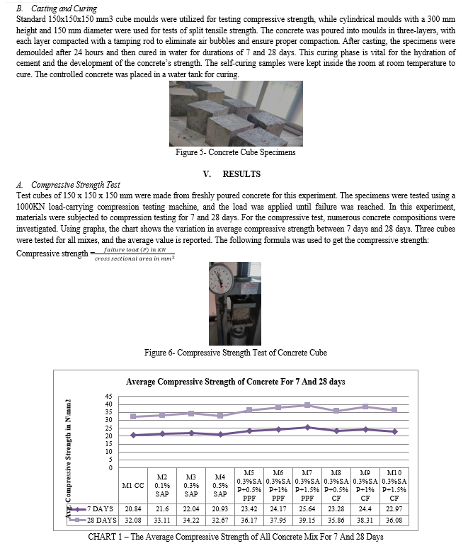 In this experiment, we produced fiber-reinforced concrete using coconut and polypropylene fibers to reduce the formation of micro-cracks that may occur during the curing process. It is essential to maintain proper moisture and temperature throughout the early curing phases in order to obtain the necessary characteristics. For optimal strength development, concrete must be maintained wet during the curing process. There are several ways to maintain moisture on the surface of the concrete, including pounding, spraying, and sealing the surface with a barrier made of curing compound to stop moisture loss. But in many cases, effective cure isn't always possible. Therefore, employing chemicals that self-cure will be the best option. Self-curing chemicals help to lower evaporation, which enhances concrete's water retention.