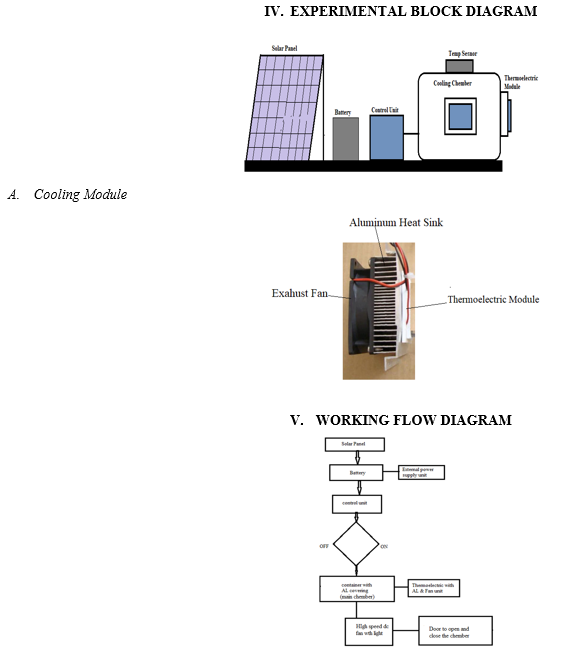 The system is designed for use in residential homes, offices, small vendors, and more. to provide a low-energy alternative to expensive and energy-intensive mobile solar refrigeration system refrigerators. The system w?s designed with size in mind. The inner chamber uses thermoelectric modules to cool the internal environment. Thermoelectric modules (TEMs) work based on the Peltier effect, where a temperature difference is created across the module when an electric current is applied. Heat is absorbed by the surface on the cold side and removed on the hot side of the module.