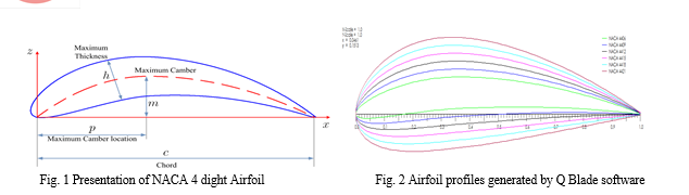 The National Advisory Committee for Aeronautics (NACA) used a four-digit numbering system to describe a large number of airfoil sections. The first family of air foils designed by NACA was the Four-Digit Series. The first digit specifies the maximum camber (m) in percentage of the chord (air foil length), the second indicates the position of the maximum camber (p) in tenths of chord, and the last two numbers provide the maximum thickness (h) of the air foil in percentage of chord. For example, the NACA 2415 air foil has a maximum thickness of 15% with a camber of 2% located 40% from the air foil leading edge (or 0.4c). Fig.1 presents the graphical profile of NACA 4-digit airfoil. NACA 4406, NACA 4409, NACA 4412, NACA4415, NACA 4418, NACA 4421 are considered for the Horizontal Axis Wind Turbine (HAWT) blade design analysis. Fig.2 present the Airfoil profiles generated using QBlade software.