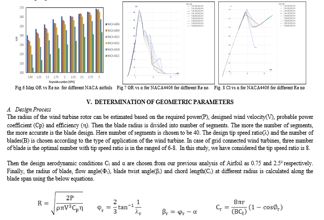 The blade angles and chord length distributions as well as the velocity triangles and force distributions of the wind turbine blade Airfoil is shown in Fig. 20 and Fig. 21 respectively. Here, the blade is divided into 40 equal sections and ‘dr’ is the length of each section. Radius of rotor axis to each section mid are denoted by rei, the subscript i refers to the section number. Firstly, the mid radius of each section from rotor axis is calculated.