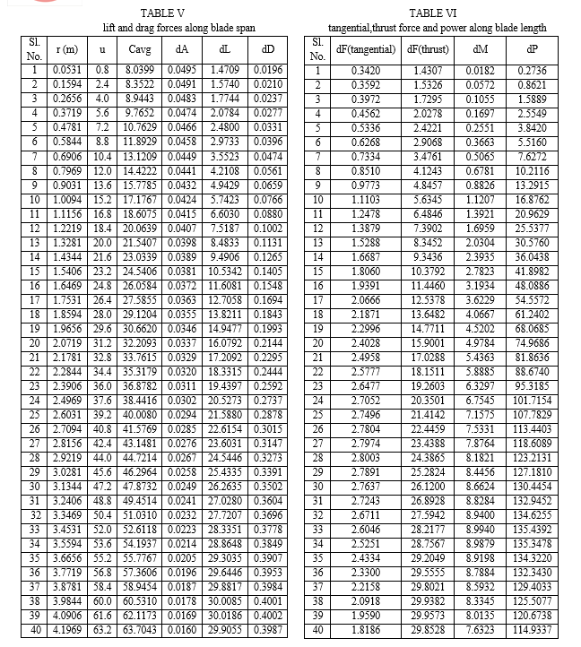 Then the relative wind velocity of each section wi is calculated. In this analysis axial induction and tangential induction factors as well as blade tip losses are not taken into consideration. Then the projected elemental areas dAbi of each section in the rotor plane is calculated for all the 40 number of sections. Finally, the lift dFLi and drag dFDi forces acting on each elementary sections are calculated along the blade span by taking CL= 0.75 and CD = 0.01. The component forces of dFLi and dFDi along the rotor axis and the rotational plane are taken into account for calculation of both axial thrust force dFthrust_i and tangential dFtangential_i forces of each section.