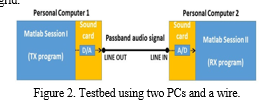The transmitter and receiver must be implemented using two separate Matlab sessions, one for each PC, as shown in Fig. 2. Real signal transmission and receiving are supported by sound cards in a limited frequency range by GC technology. Fig. 2 shows how the transmitted data are created in Matlab and transformed to analogue domain before being transferred via the transmitter's sound card. To send the signal outside of the PC, a cable is attached to the LINE OUT jack. The cable is attached to two electrodes that stand in for the GC transmitter, which transmits the signal over the tissue via GC communication technology, as will be explained later. The received signal is detected by the electrodes of the two receivers on the opposite side, and it is sent to the other PC through a cable attached to the LINE IN jack.