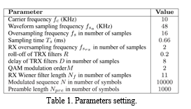 To launch the receiver application, which uses Matlab commands to record the received signal and save the data in the array, a Matlab session must be open in the PC linked with the GC receiver's electrodes srx. According to Fig. 5, a digital down-conversion is carried out by multiplying the received sampled signal srx by cos(2*pi*f'cn Tsa) and sin(2*pi*f'c nTsa), where f'c is the carrier frequency at the receiver, to obtain di(nTsa) and dq(nTsa), respectively. This is done after recording srx in digital format, which passes through. For BPSK, the sequence d(nTsa ) = di(nTsa ) + jdq(nTsa) is sent to an SRRC filter, resulting in a baseband received signal r(nTsa) with n = 1, . . . . fs N-1. Di and dj are separately routed to the SRRC filter for OOK, and its outputs are ri and rq. With the knowledge that the same process is applied individually to ri and rq in the case of OOK, we will simplify the notation in the following by referring solely to the signal r of the BPSK. OOK is not susceptible to frequency synchronization issues, although r of BPSK may be. Keep in mind that r also refers to the actual BPSK-BB signal that comes from the SRRC filter, for which the prior down-conversion is clearly not done. In order for the subsequent blocks to operate at two samples per symbol (fsrx=2, as described in Table 1), the output r is then decimated by eight. The sampled signal that was obtained may be represented as
