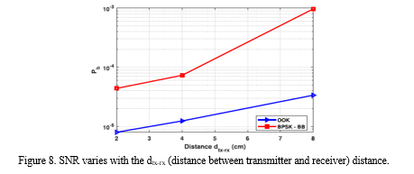 Here, we select BPSK as a potential modulation method. Figure depicts the sent and received signals at a distance of 4 cm between the transmitter and receiver and an inter electrode distance of 1:5 cm at both the transmitter and receiver. The received signal is shown at several stages, demonstrating the amplitude decrease between the sent and received signals as well as the distortion and compensation at the receiver. Both the time and frequency domains are taken into account. The signal's amplitude decreases as the distance between the transmitter and the receiver changes, as predicted. Particularly, the amplitudes of the received signal at 2, 4, and 8 cm are respectively two, three, and four orders of magnitude lower than those of the sent signal. In instance, Fig. 9 illustrates the received signals for various dtx-rx distances in the frequency domain and demonstrates that, aside from an amplitude drop, the form of the signal remains the same between 2 and 4 cm, while a significant distortion develops at 8 cm but is rectified after filtering.