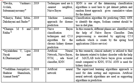 In this research paper to comprehend the machine leraning strategies to foresee kidney stones. They anticipated great precision in addition to C4.5, Classification tree and Random forest followed by Support Vector Machines (SVM) Logistic and KNN has likewise shown great exactness results with zero relative outright blunder and 100 percent accurately arranged outcomes [9]. ROC and Calibration bends utilizing Naive Bayes has likewise been developed for anticipating precision of the information. The Neural network algorithm along with other datamining techniques showed high potential in effective kidney sickness. This exploration depicts a proficient Diagnosis of Kidney Images Using Association Rules. Their methodology is separated into four major advances: pre-handling, include extraction and determination, affiliation rule age, and age of analysis ideas from classifier. This paper dissected that the most normally utilized Data Mining strategy like Decision Trees, ANN and Naïve Bayes, Logistic Regression, Genetic Algorithms (GAs) coming about also performing on clinical data sets. Additionally shows that DTs, ANNs and Naive Bayes are well performing calculations utilized for Kidney disease.