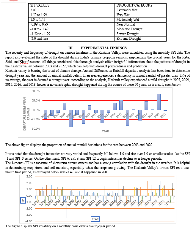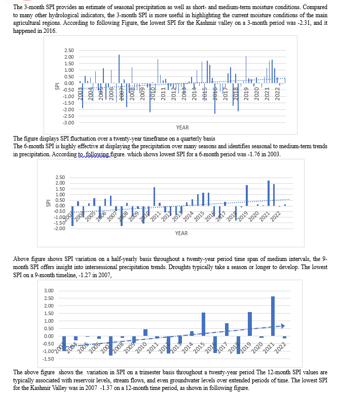 Over the research period of 2003–2022, there hasn\'t been a single year of severe drought. Just four moderate droughts occurred in the Kashmir valley during the research period (the previous 20 years) in the years 2007, 2009, 2012, and 2016. Furthermore, the SPI trend lines indicate that the SPI is growing across all sizes. This suggests that the area is experiencing fewer droughts on a regular basis. During the year 2007, there was a moderate drought with a high SPI value (-1.37).