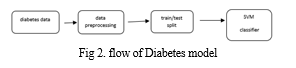 In the process of building of the diabetes model we have used the support vector machine. The process is same for the SVM model as logistic model. Here we have trained the model with the database of diabetes from the Kaggle. Here firstly we must normalize the data into same intervals. Then the Support vector machine classifier is used to enhance this data so for that we must create the SVM model [1], and we fit this data into that model. As a result, we will get the SVM classifier model. This SVM classifier model [4] is checked with the testing data and after getting a good accuracy.