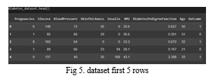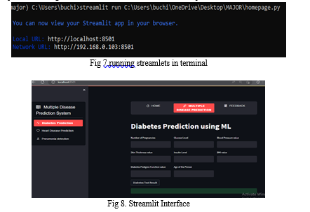 The implementation of the interface happens through streamlit-option-menu [10] library where the three options are diabetes, heart disease, Pneumonia and the models are loaded on their respected options. The diabetes takes the input of 8 attributes with specified values mentioned and the button get result shows the result after giving all inputs[12]. Same as diabetes the heart disease takes 13 attributes as specified names and gives the result. Whereas the Pneumonia model asks to upload the x-ray photo and gives the result whether it is normal or pneumonia. Fig shows the interface of three diseases as options at the left of the interface.
