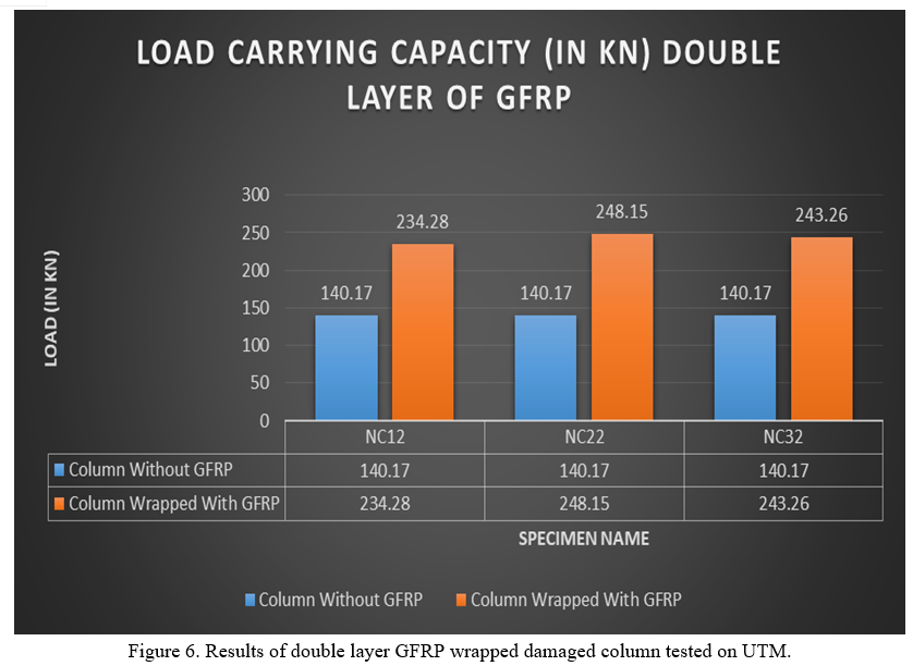 From the tests conducted on columns, it has been observed from the graphs (from Figure 2 to Figure 7) that on the application of GFRP layers, there is a tremendous increase in the load carrying capacity of the column. Also, during the t,ests it was found that, proper method of application of GFRP layers and proper mixing of resin and hardener is of utmost importance as it shows the difference in results. With increase in the number of layers of GFRP, the load-carrying capacity has been found to be increased. This is due to the superior properties of FRP composites such as lightweight, high strength, corrosion resistance, and large creep strain, high fatigue resistance, less weight comparing to steel repairs and ease in installation. FRP wrapping systems has been found an attractive and easy retrofitting technique that can significantly enhance the strength of concrete columns and also the confinement of concrete for the newly constructed column is good so the load-taking capacity more as compared with damaged column. Because in the case of the damaged column the column is first damaged, because of which the confinement of concrete reduces in the case of the damaged column and so the load-carrying capacity also reduces in comparison with the newly constructed column.