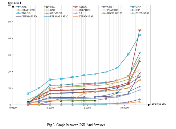 From the samples of nano composites with the increase of stress from 100Pascal to 3200 Pascal the same pattern is followed CNP has maximum value of JNR and GNP has minimum value of JNR.From the samples of additives also the same pattern is followed Crumb Rubber has maximum value of JNR and Sulphur has minimum value of JNR. From the sample of viscous fluids while moving to higher stress Expanseal has taken place of Bio oil for maximum value of JNR and also Chemaflex has taken place for minimum value of JNR instead of Permalastic and Chemseal .
