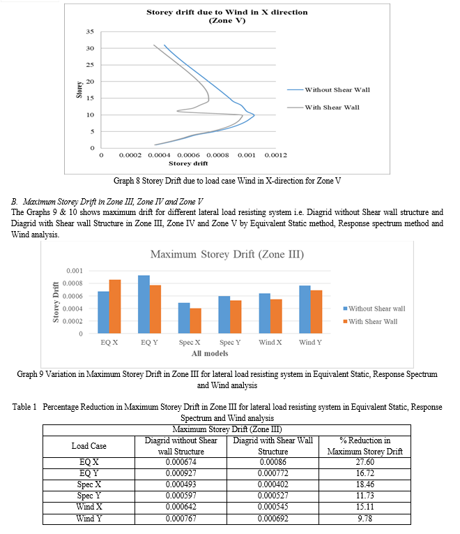2) Significant reduction in maximum storey drift is observed for Diagrid with shear wall structure by equivalent static analysis up to 27.60 % and in response spectrum analysis and wind analysis Diagrid without Shear wall structure it up to 18.40 % and 12.60 % in X direction.