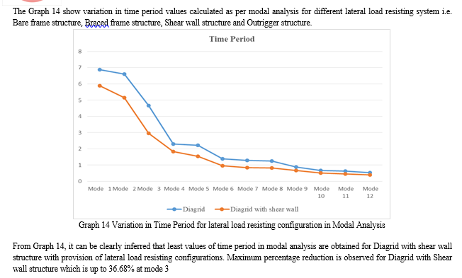 10) The natural time period of structure are closely spaced, while Diagrid without Shear wall structure time period increased 1.2 times as compare to Diagrid with Shear wall Structure.