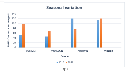 Figure displays monthly variations in average mass concentrations of PM10. Peak monthly PM10 average mass concentrations were observed in October, reaching 120.8 g/m³ for the year 2020, and 124.6 g/m³ for the following year, 2021. In 2020 PM10 decreased from march to august due to restriction on traffic movement and closing of industries and again increased due to some relaxation in lockdown. Mainly coarse particulate concentration increased in case of dust storms. The lowest monthly average concentration of 33.9 µg/m3 in the month of august for year 2020 and 38.9 µg/m3 in September for year 2021. Additionally, precipitation and stronger convective air currents assist in the removal of coarse particles. The annual average PM10 concentration is 91.69 g/m³ in 2021 and 76.23 g/m³ in 2020, which is higher than the national ambient air quality guidelines i.e. 60 g/m³