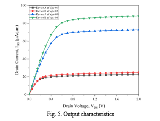 Charge sharing is the main source for Vth roll-off. The Threshold voltage variations (Vth) for Device A and Device B are shown in Fig. 2(a). For Device B acquired higher threshold voltage then Device A. From the graph, it is observed that the threshold voltage of two devices is determined to be 0.278 V and 0.282 V, respectively, at a drain voltage of 0.1 V. The threshold voltage begins to reduce as the channel length is shortening in CMOS devices because depletion region charge is supported by source and drain. An increase in drain current is observed in the underlap device with an increase in drain voltage as the gate voltage is varied from 0 V to 1 V. For a drain voltage of 0.1 V, the maximum drain current for the device A is 19 µA/µm, while it is 21 µA/µm for the device B. A similar trend is also observed for increased drain voltages where the drain current for device B is 124.88 µA/µm when compared to 102.42 µA/µm for the device A at drain voltage of 1 V that are shown in Fig. 2(b). Hence, the rectangular GAA FET with underlap device holds an upper hand in respect to performance and switching speed as shown in Fig. 2(c).