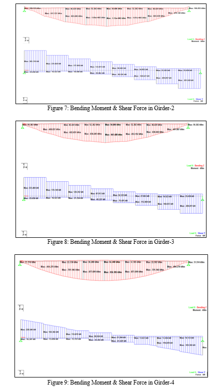 Grillage deck analysis has been performed to determine the moment and shear demands on girders and slab. Staad Pro software is used to perform this analysis. Figure 3 shows the grillage model of bridge slab and girders as modeled in Staad Pro. The Staad analysis showed that class 70R wheeled loads in 2 lanes and a single class A wheeled load in the 3rd lane created the maximum longitudinal flexural and shear demands on the girders whereas the class A eccentric lane load with just 150 mm clearance from the edge of the carriage way on the outer lane created maximum transverse flexural and shear demands in the slab. Within the slab, the Class 70R, 40 ton maximum bogie load created the maximum positive and negative flexure and shear forces in the transverse direction.