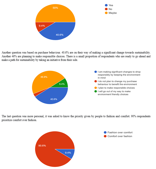 The following sample gave us a sneak peak into consumers' minds about their view on sustainability and their purchasing ways. This helps us to know the areas where we can improvise and put emphasis if we want to go ahead with sustainable fashion. The consumers need to be aware of the need and ways of the shift they are making before being asked to do so.