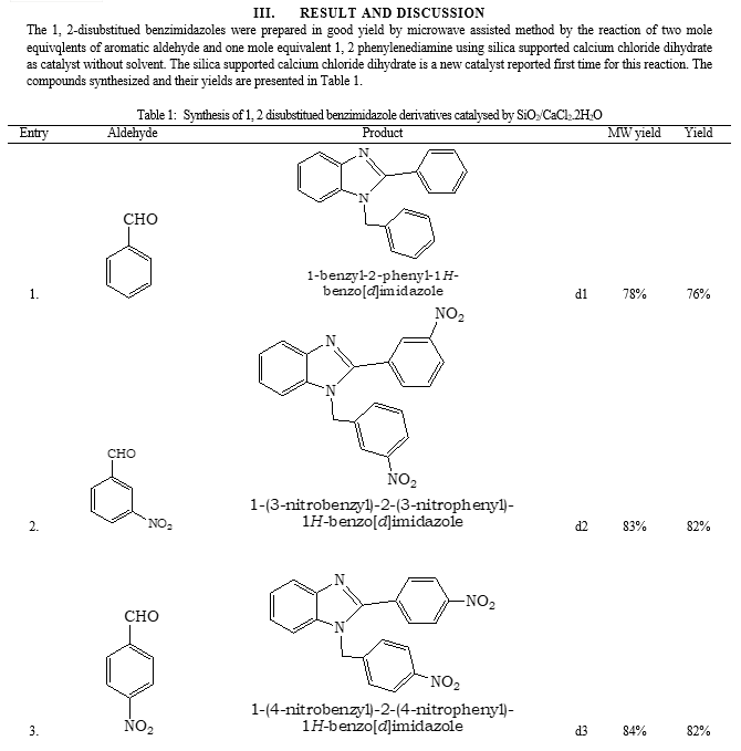 Other method is the condensation of an aldehyde with arylenediamine (17-18). According to the literature studies it reveales that several procdure for synthesis of benzimidazole and its derivatives using hypervalent iodine as oxidant (19), oxalic acid (20), H2O2/HCl (21), TiCl4 (22), PPA (23), SOCl2/SiO2 (24), L-Proline (25), Sulphamic acid (26) and Zeolite (27). Expensive reagents, oxidation processes, and long reaction times are the considerable drawbacks of these methods. In connection with our ongoing research for the development of simple and efficient methods for synthesis of benzimidazole compounds, now we report Syntheis of 1, 2 disubstitued benzimidazoles using SiO2/CaCl2.2H2O as a catalyst (28, 29)